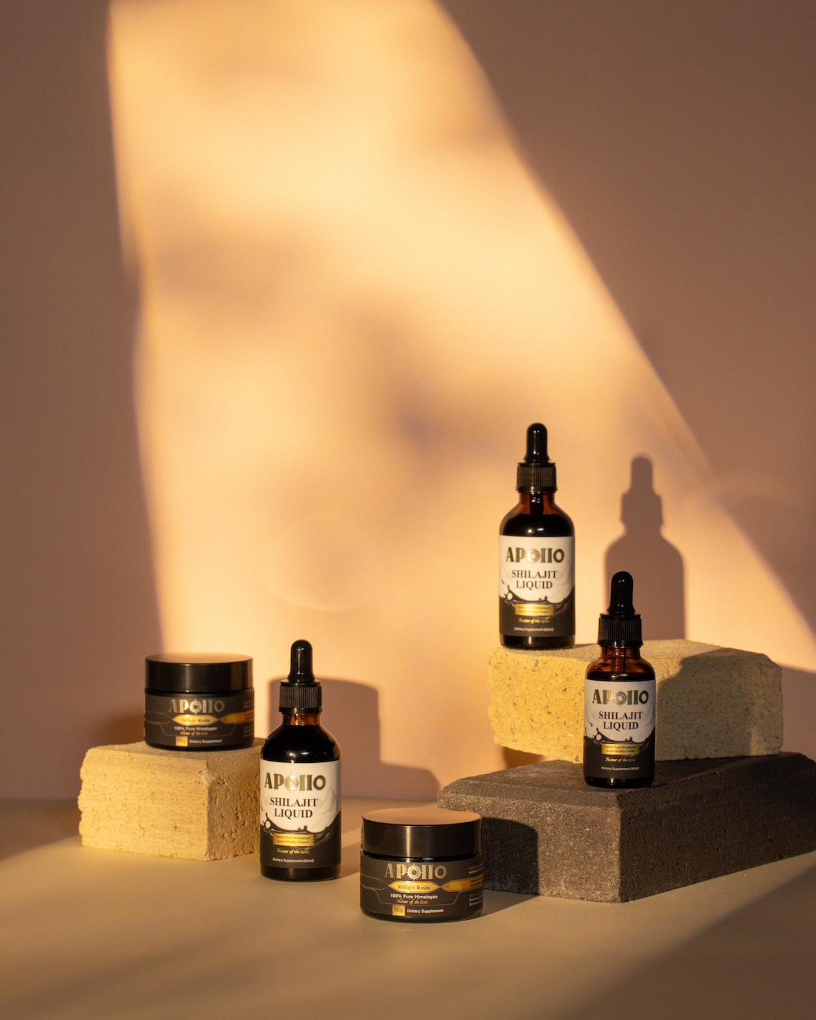 A sample of product and lifestyle photography featuring the Shilajit range developed by Apollo Nutraceuticals.